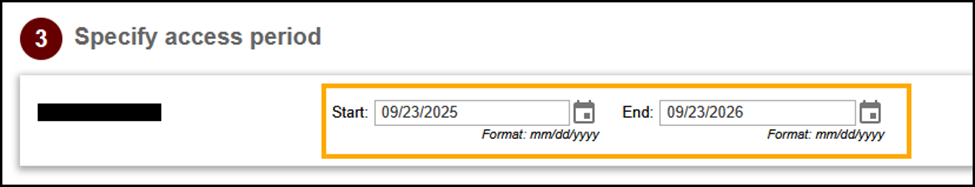 10. In Section 3, select a start and end date for your access. Typically, this is a year, but you can select a shorter duration.
