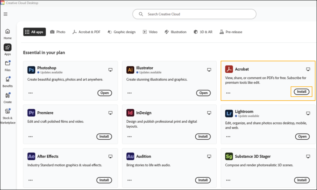 Adobe Acrobat is part of the Adobe Creative Cloud suite. To download and use Acrobat, you must first install the Creative Cloud app on your device. Follow the instructions below to get started.