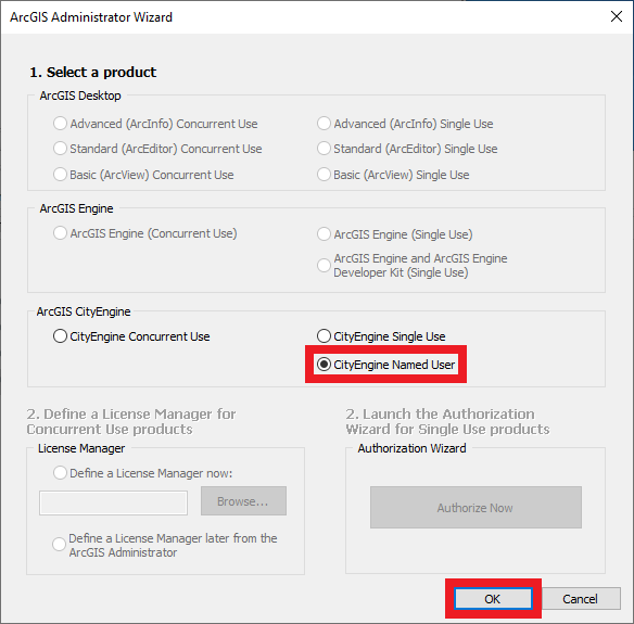 ![]() | ArcGIS Administrator Wizard: * Select CityEngine Named User. * Click OK. |