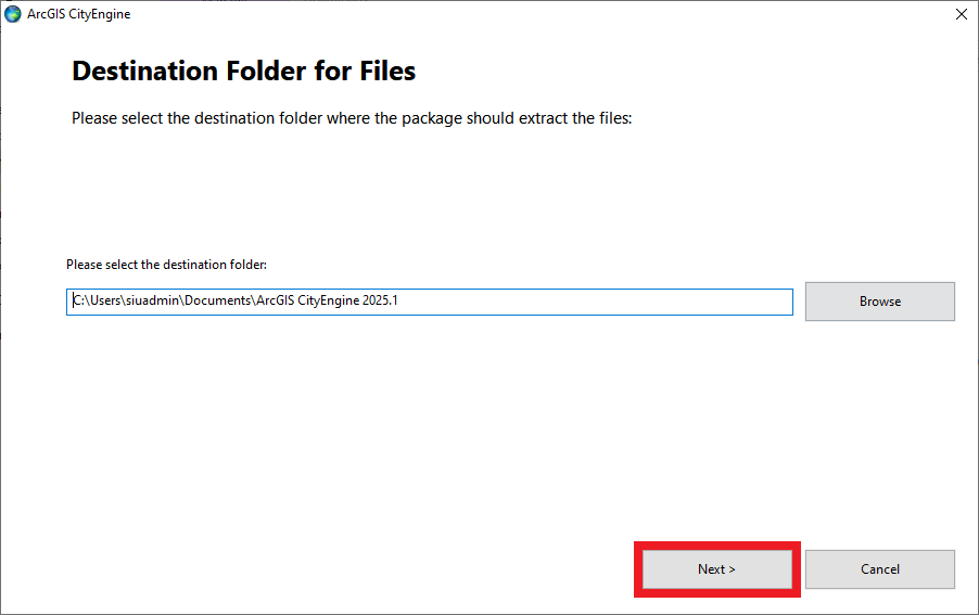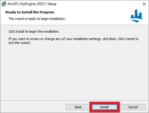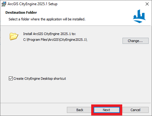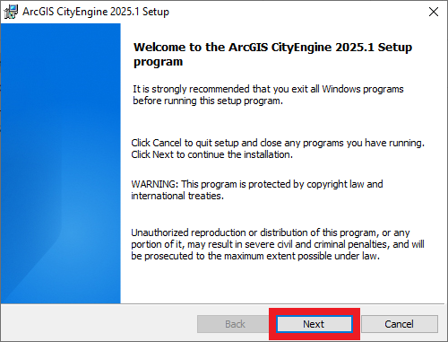 ![]() | Welcome to the ArcGIS CityEngine Setup program: * Click Next. |