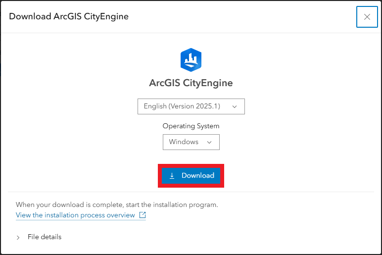![]() | Download ArcGIS CityEngine: * Click Download. * Open the downloaded installer and follow the installation prompts. |