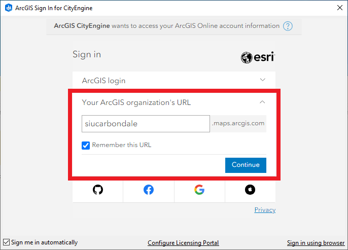 ![]() | Enter ArcGIS Organization URL: * Click Your ArcGIS organization’s URL. * Enter URL: siuc.maps.arcgis.com * Check Remember this URL. * Click Continue. |