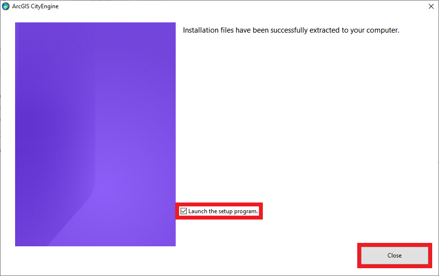 ![]() | Installation files have been successfully extracted to your computer: * Check Launch the setup program. * Click Close. |