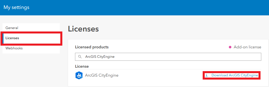 | Licenses: * Click the Licenses side tab. * Next to ArcGIS CityEngine, click Download ArcGIS CityEngine. | |