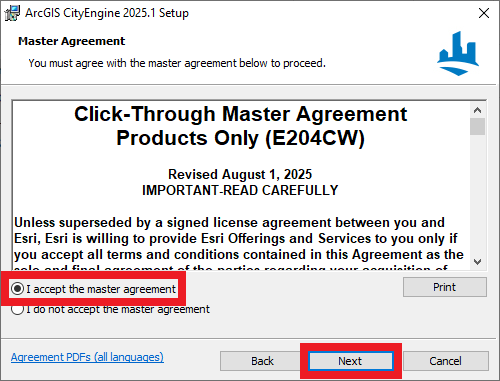 ![]() | Master Agreement: * Select I accept the master agreement. * Click Next. |