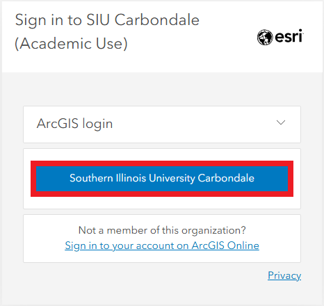 ![]() | Sign in to ArcGIS Online: * Open https://siucarbondale.maps.arcgis.com/. * Click Southern Illinois University Carbondale. * Sign in with your @siu.edu email address and password. |