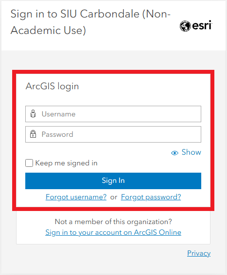 ![]() | Sign in to ArcGIS Online: * Open https://siuc.maps.arcgis.com/. * Sign in with your assigned ArcGIS username and password. |