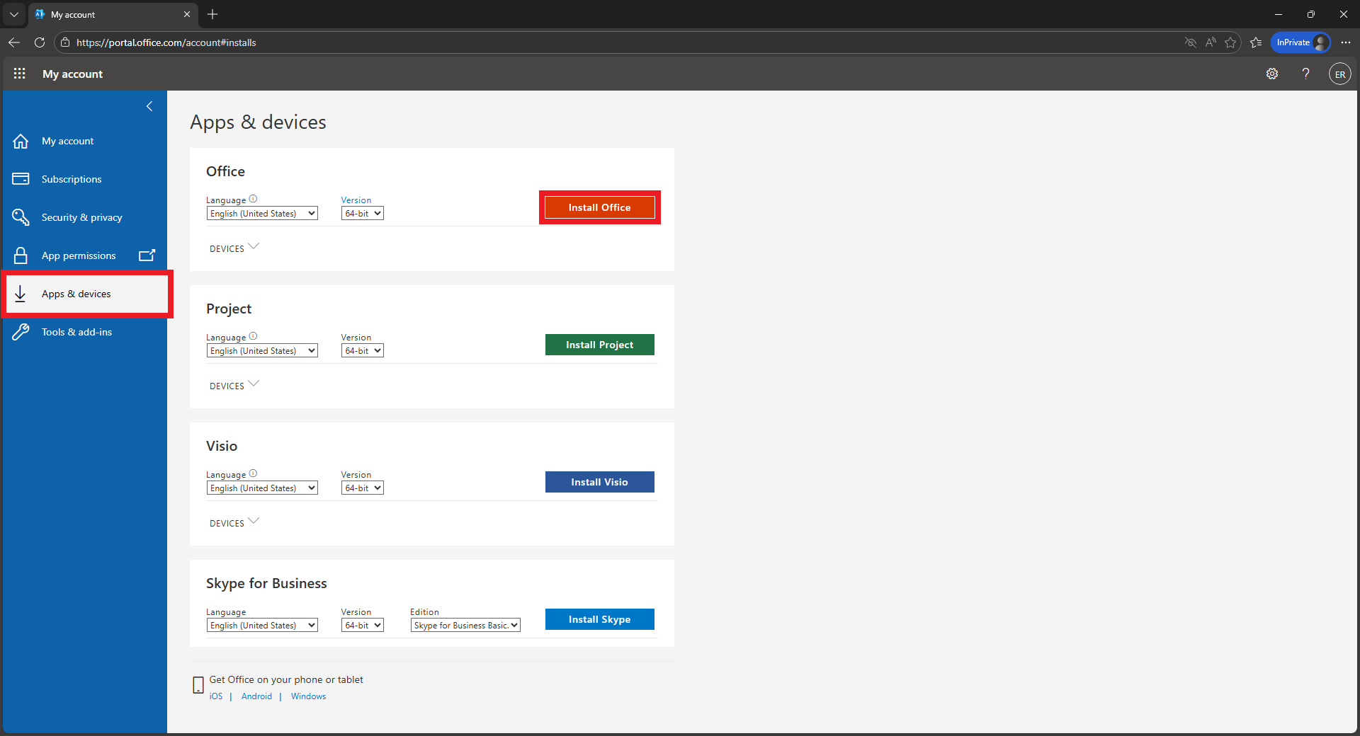 ![]() | Install Microsoft Office: * Select Apps & devices. * Click Install Office. * Open the downloaded installer and follow the installation prompts. |