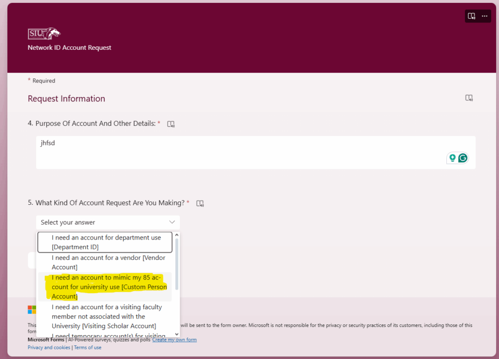 6. From the drop down menu, select “I need an account to mimic my 85 account for university use [Custom Person Account]”