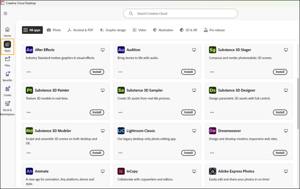 7. Once signed in, click the Apps button on the left-hand menu to view all the Adobe Creative Cloud apps that are available for installation.