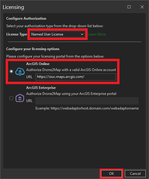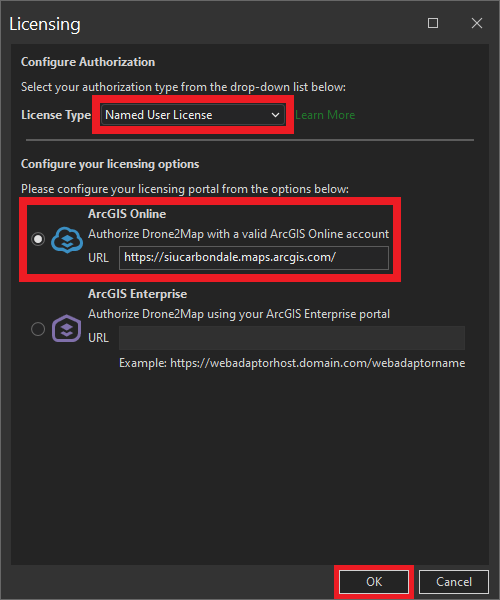 ![]() | Configure Licensing: * Select License Type: Named User License * Select License Portal: ArcGIS Online * Enter URL: https://siuc.maps.arcgis.com/ * Click OK. |