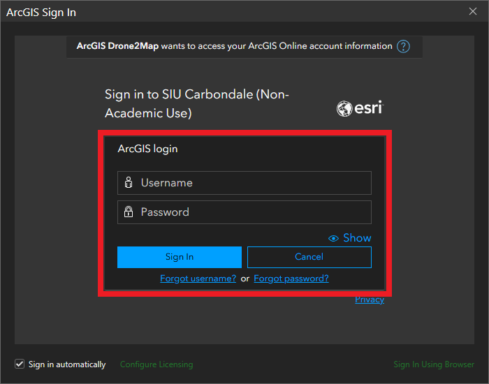 ![]() | Sign in to ArcGIS Drone2Map: * Sign in with your assigned ArcGIS username and password. |